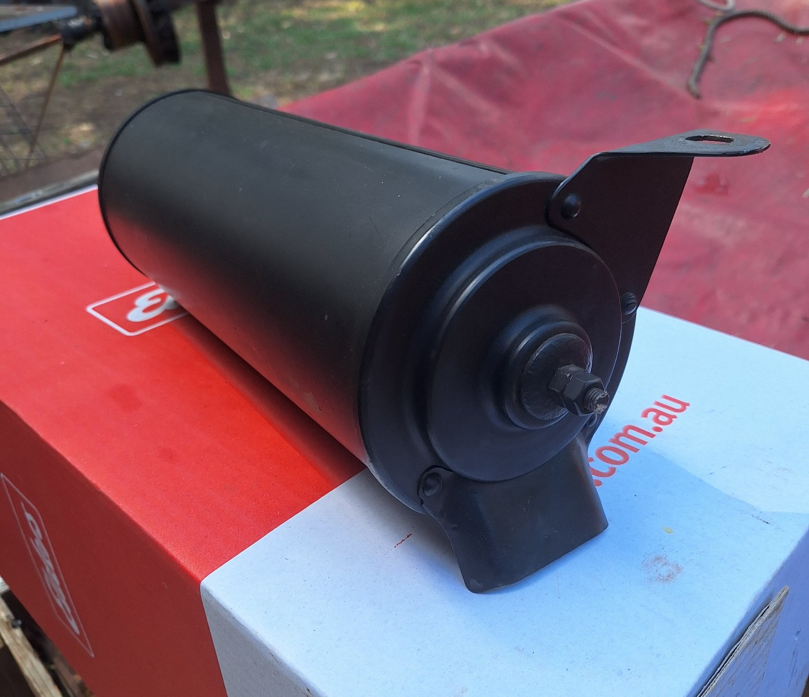 Notice the riveted on bracket and separate deflector. Like US production, the ends appear to be pressed with two thicknesses of thinner material. On the front end there is a lair of crescent shaped cut-outs on the small lip that goes to the exhaust pipe. Instead of the rolled in Ridge used on the US exhaust pipes, up to which the muffler end is jammed, the Canadians drilled the pipe and installed a 1/4" cotter pin as a register for the front end cover