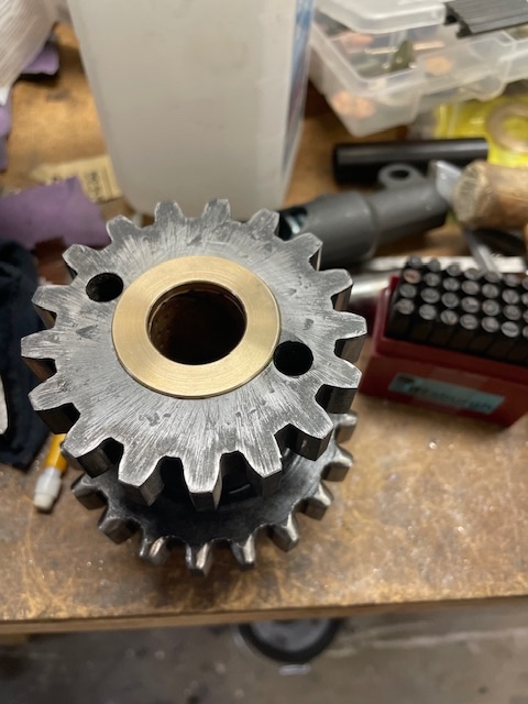 So here is the question, did the original bushings extend past the gear to provide a friction surface? If they did I could replace them or machine out a space and press a bronze thrust washer in the end of the gear to build up the thrust surface.