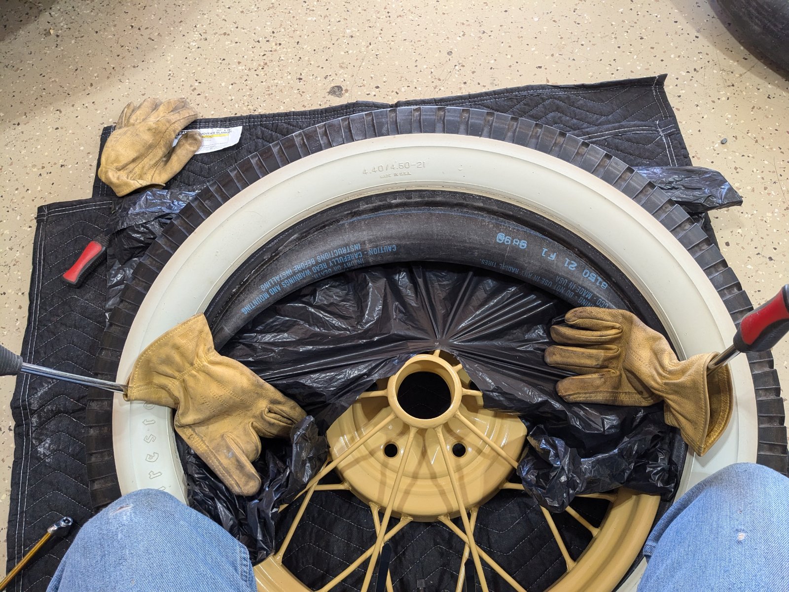 You are correct. However in my case, the tires are maybe 30 years old and the I couldn't get the tires warmed up, so they were a bit stiff. I did use the garbage bag method which works great, but I was just not strong enough to get these tires pushed over the rim. That's when I came up with the idea about using the leather gloves over the spoons. I also have those big HF tire irons and those ends easily fit into a leather glove.Art Ebeling wrote: ↑Mon Dec 09, 2024 11:48 amModel A tires can be mounted without tools, I just did six using plastic trash bags to make the tire slide over the wheel.