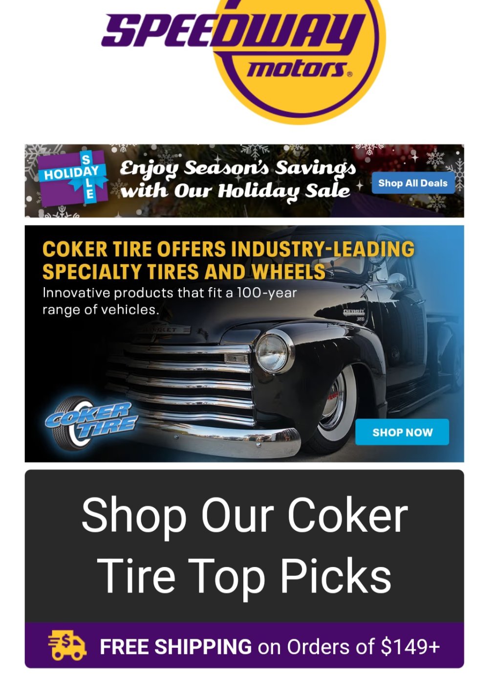 Try Speedway Motors. Just received the AD below indicating free shipping on orders over $149 on Coker tires.