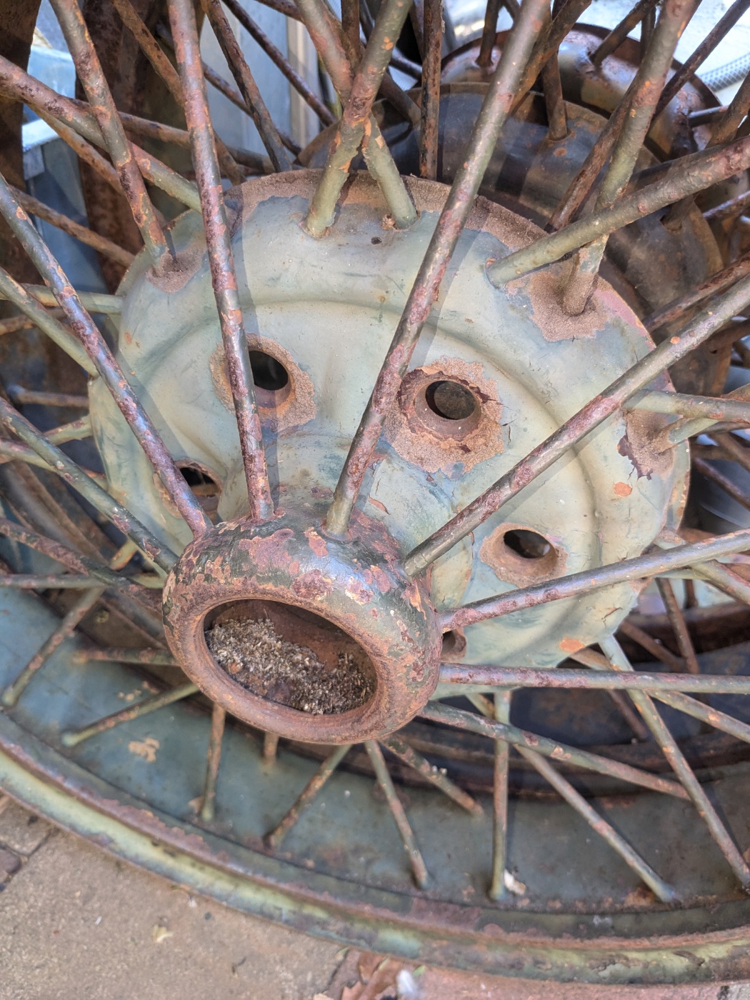 Hopefully someone from the Model T "brains trust" can shed some light on these wire wheels which were attached to a 1927 T rear axle in some parts I collected this week. At first they looked like Model A wheels but they are clearly not. They are six lug bolt on wheels with welded spokes onto split ring rims. The rims are 20inch. The spokes are welded on the rim but poke through the hub. The six stud holes match the wooden wheel stud pattern on a Model T hub which is obviously why they were used on the T axle on a farm. The wheels were not attached with proper wheel studs or nuts. The hubs are like a more stubby Model T or A hub. They are quite neat wheels (three of the four seem good) so I thought I might use them on my T racer. They may be an easy fit. Once I know what they are, I can maybe track down a better fourth one, but for the moment, they are a bit of a mystery to me. Appreciate anyone's thoughts.