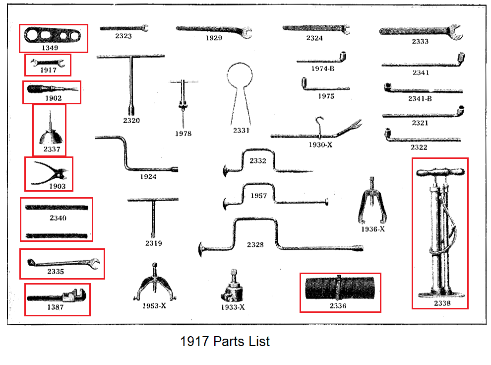 . A 1917 would contain in addition to listed tools above, a 1387 adj wrench, 1903 pliers, 2327 oil can, and 2338 tire pump.