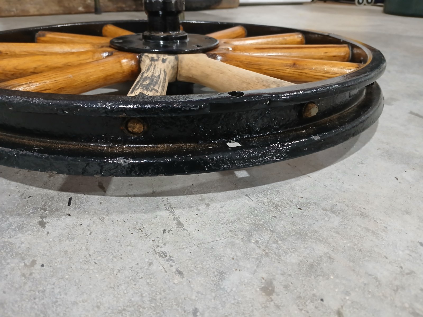 I decided I wanted to refinish my wheels not too long after I got the car and began working on it. The spokes had been refinished sometime in the past, but it had worn off and did not look that nice anymore, but more importantly the wood had began to show age and had a light gray tone on the surface, being exposed directly to the elements. I wanted to refinish them before they deteriorated any more. They were nice, solid wheels, and I want to keep them that way, there's a good chance they are original and were probably painted black to begin with.