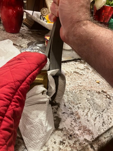 I was recently gifted this beautiful Stewart & Clark Mfg 1908-1914 "Chelsea" brass dash clock. I want to untwist it from the rear dash mount so that I can wind it and fix it if it is broken. It has so far resisted my efforts. It should unscrew from both the front bezel and the rear mount. The front bezel comes off easily, the rear mount does not. I tried WD-30 on the rear mount clock thread, waited 12 hours, tried it, WD-30 again. Over my wife's objections I commandeered her leather belt, wrapped it on the rear mount and used a strap wrench on the clock but it did not turn. My channel lock pliers with a cloth to protect the piece are not big enough to get around this. I don't want to damage the brass case or the clock. What else can I try?