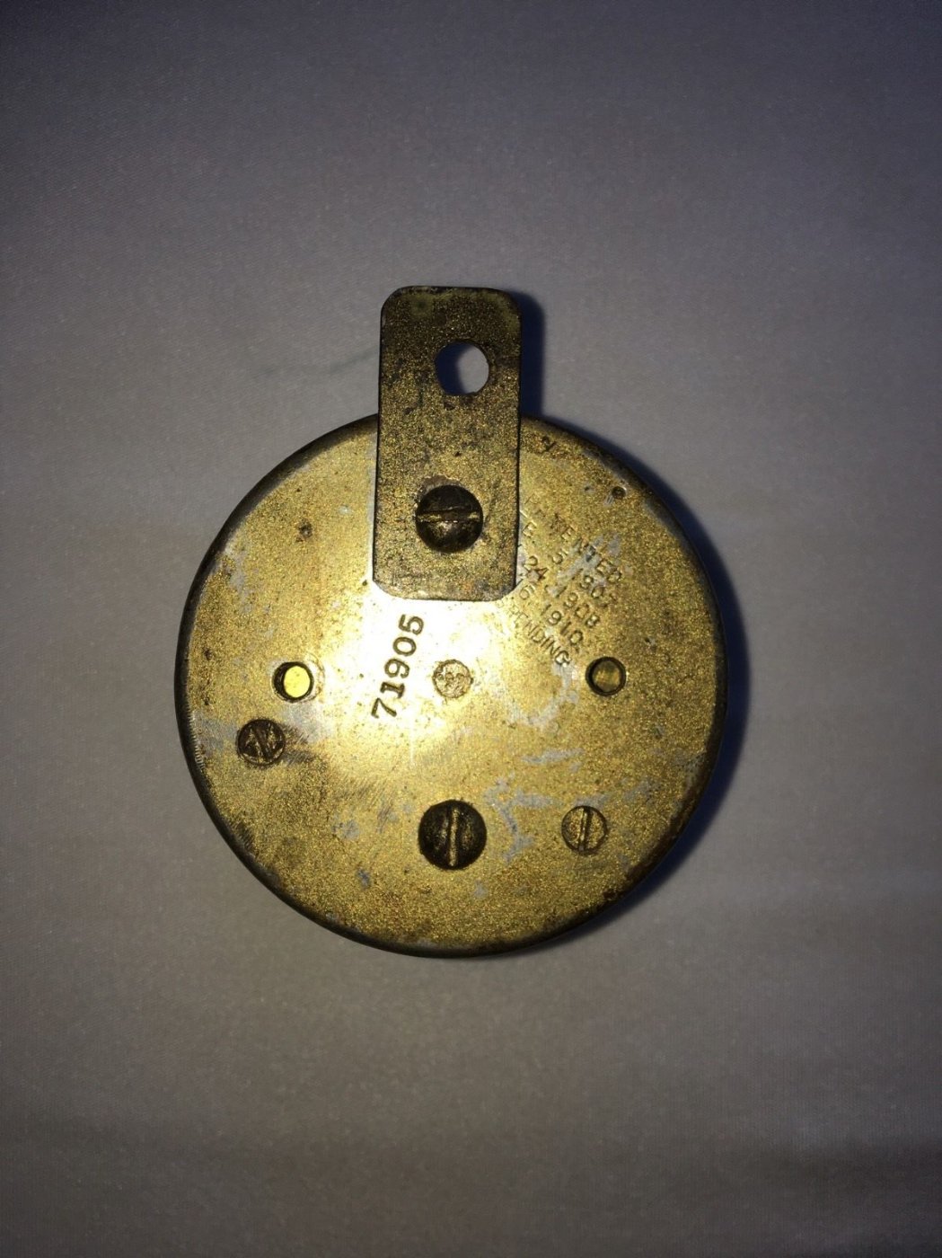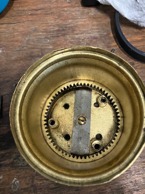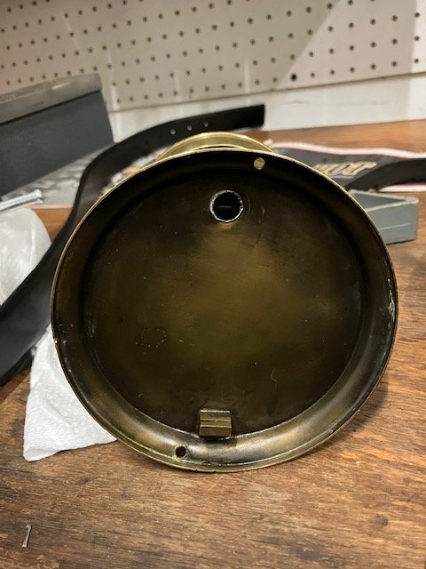 Now you have it, three screws on the back allow the mechanism to be removed from the case. The two extra holes with the shadows around them indicate where two mounting studs once were. These were probably removed to fit your clock into that tubular brass mounting. Mine has a U shaped bracket attached to the two studs,{missing on yours} that allows the clock to be fitted into a metal dash board.