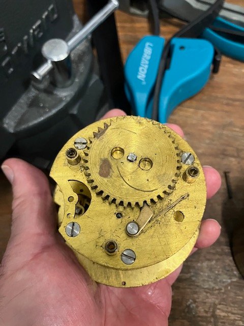 Colin, It came off the base after I purchased new strap wrenches. The rubber was too hard on my 30 year old strap wrench. Ironically nothing but friction was holding the clock on. Someone in its past damaged the base by drilling a hole in the mount and apparently trying to punch it out. The penetrating oil was apparently working as it got through. The threaded edge on the rear mount was a head-fake. It is probably a missing bezel that screwed on. My expectation was that there would be a winding mechanism on the back but there isn't one. There is a mysterious lever under the top bezel of unknown function. If I rock it back and forth it ticks for a little while then stop. Did they have self-winding in that time? I am not sure how this dude works.