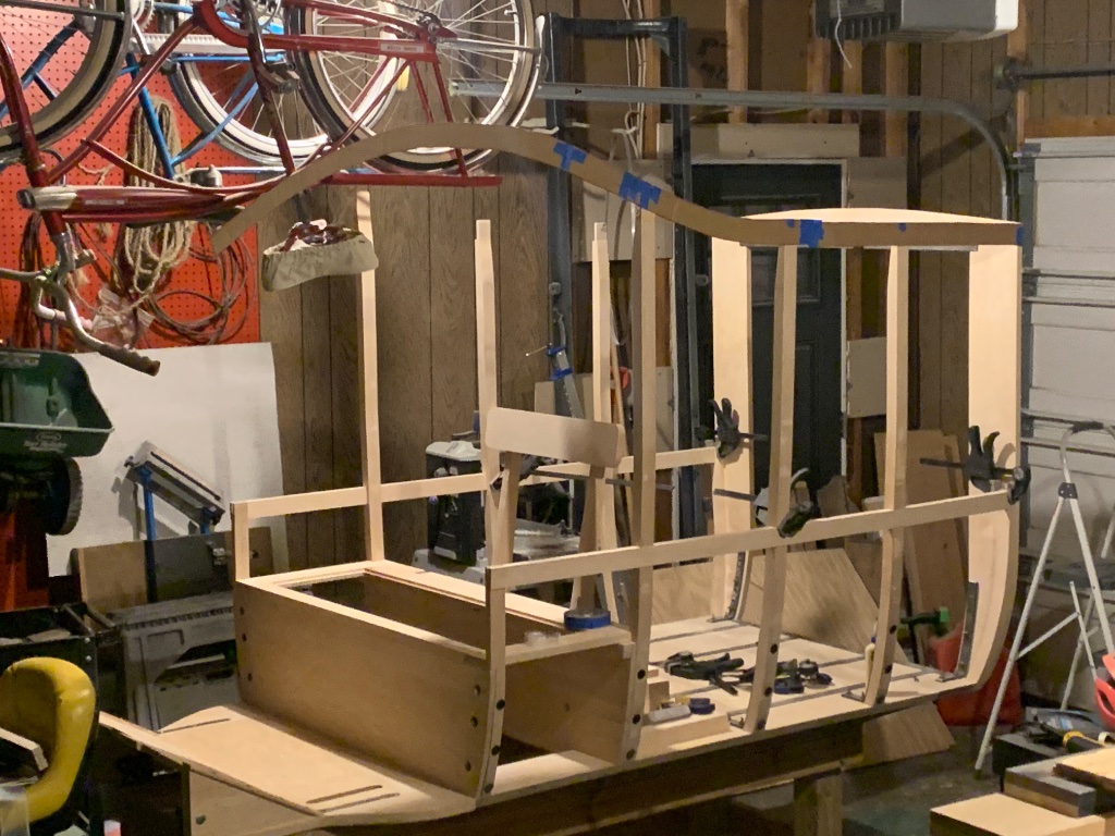 Finally got the roof rails cut out and got the top bows (9 of them) cut out and fastened. Next to finish will be the “C” sections, which will then finish the whole profile of the body. Getting closer!