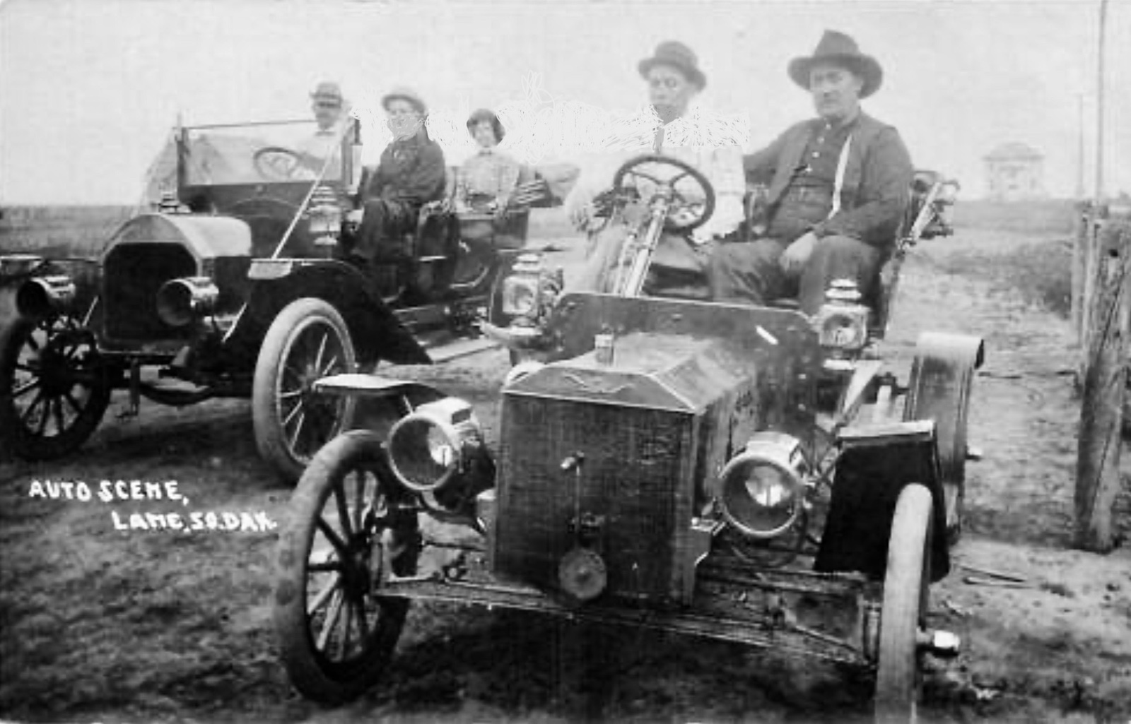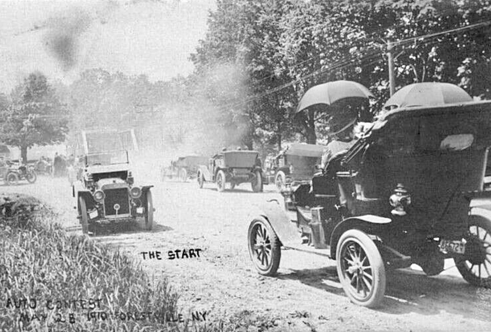 I have no idea who labeled the fifth picture "the start", or why? But it sure is fitting. The "start" of the automotive era and traffic! At least six automobiles (I think a seventh in the dust cloud?). The nearest one might be a two cylinder Reo. The next nearest one coming toward us appears to be a model K Ford, probably a 1907 or 1908.