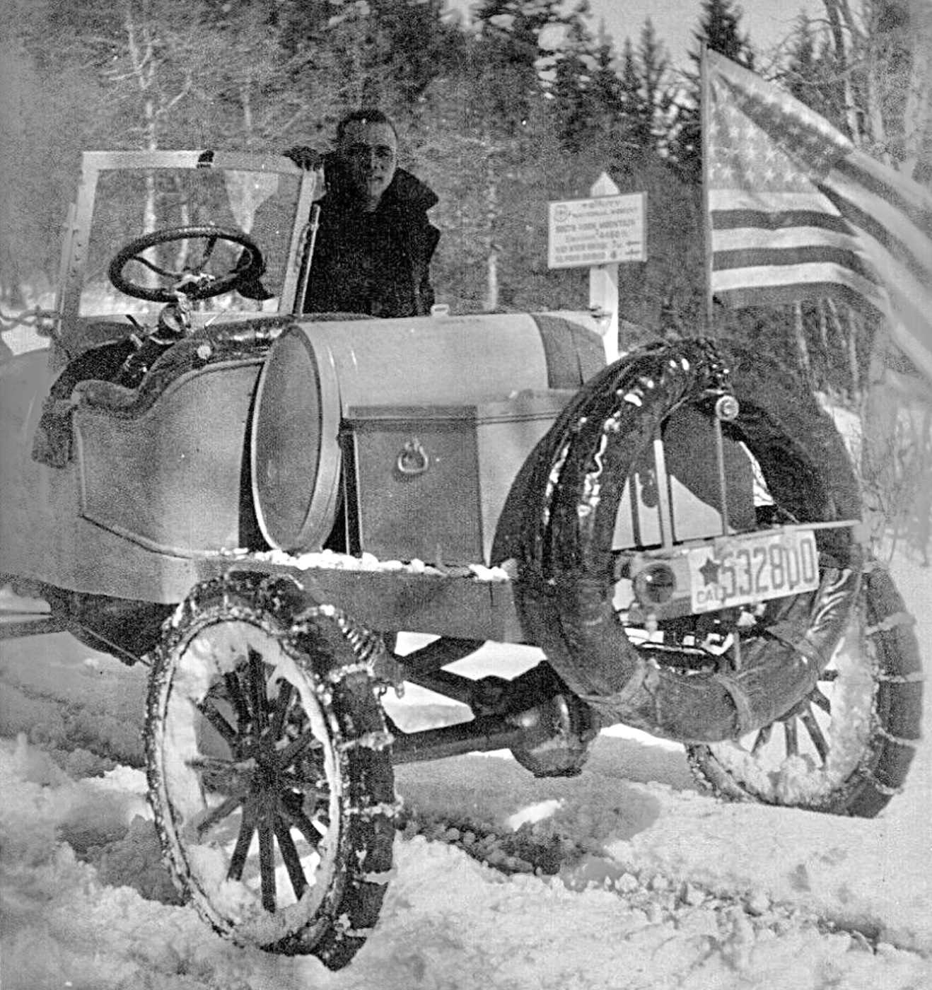 Photo number eleven is a really nice model T speedster, with a 1919 California star license plate, and waving the American flag, celebrating "we won the war!" The fatman steering wheel, and tire chains in the snow make the picture even more wonderful.