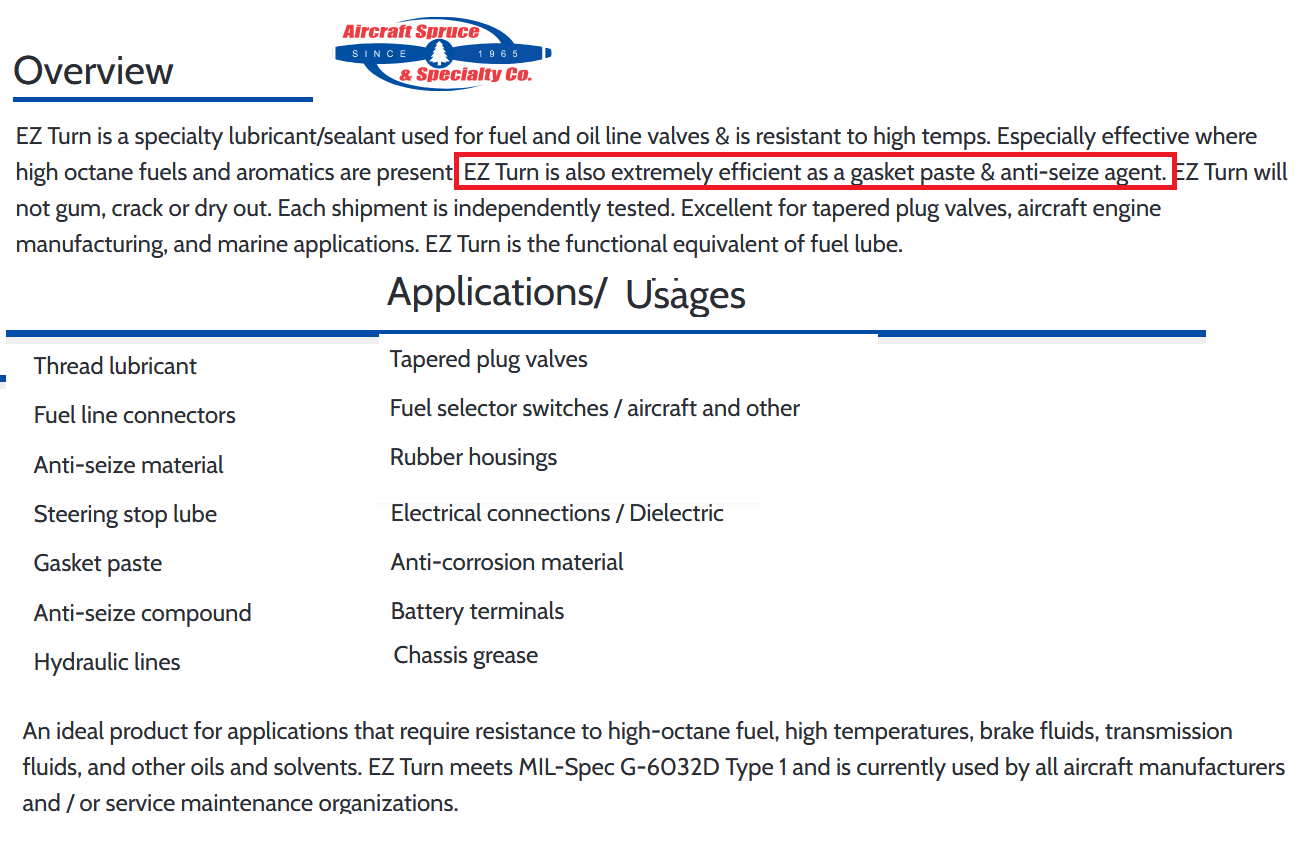Does this help?Bill Robinson wrote: ↑Fri May 23, 2025 5:03 pmI know that some folks apply a gasket- (example: Crankcase pan lower cover gasket) by applying RTV sealant between the engine block and the gasket (apply to one side of the gasket), and then applying a real heavy grease to the cover rather that use RTV, then bolt the cover to the block. To be clear one side of the gasket gets RTV and the other side gets heavy grease. The goal is easy removal and re-use of the gasket. My question is- has anyone ever used the aviation product called EZ TURN? It's not effected by water, oil, gas and it is used on many aviation applications to this day.