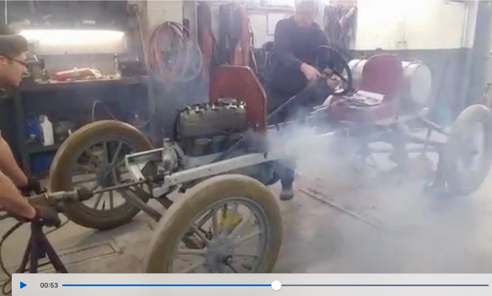 Peter and the folks at Fawcett Restoration get the racer going. The cylinder side ports are open, and that makes cranking a little easier. Peter also drove the car a bit, and said "it's fast." Click on the link below to see the start:
