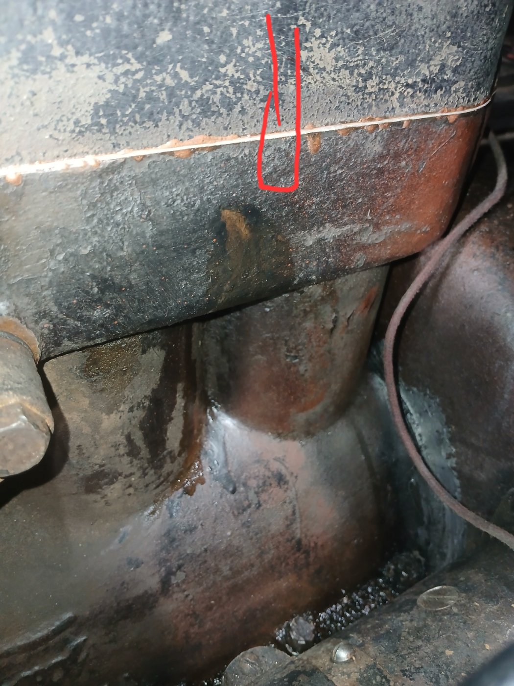 You might want to just throw a bottle of "Bars Leaks" in, and see if it stops on it's own. You might never have to mess with it again, until you overhaul the engine. At that point you can get it weld-repaired, and be done with it. I agree with all the others that it is an OLD failure, perhaps 50-75 years. Bars-leaks is a fast, cheap and easy solution, if it works. Which it probably will. That is just a TINY crack you have there! My bet is if you throw a bottle of Bars-Leaks in, it will stop it right there.
