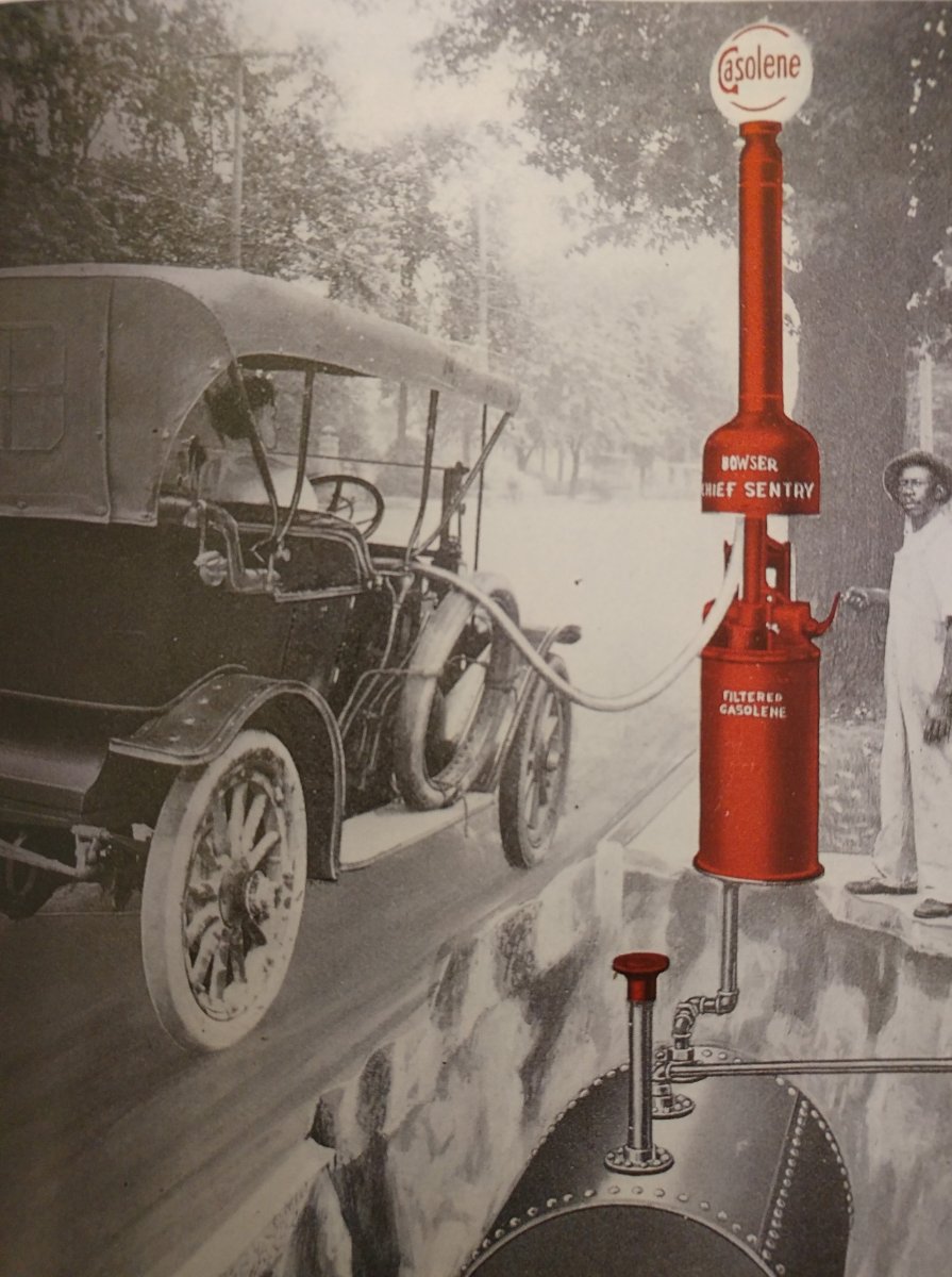I think by the time the Model T came along in 1908 cars were common enough that a lot of blacksmith/mechanic shops and livery stables had pumps. Earlier, believe it or not, one source of gasoline or other motor fuels was the local drug store. Of course in a small town the general store sold motor fuels, lubricants, and of course kerosene for your lamps, along with everything else. The kerosene, gas, and oil were sold in square five gallon cans. Standard Oil would give you a free Rayo lamp if you bought enough kerosene. Mom was born in 1910, and being the youngest kid her job was to reach into lamp chimneys with a piece of newspaper to wipe out the soot.