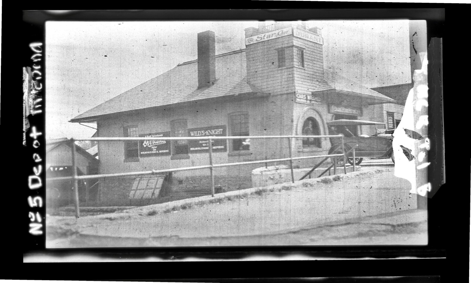 Since I came across the negative of the Model T's under the shed in Independence, Missouri (first post), I had wondered why a railroad would store worn out and rather decrepit looking automobiles under a shed. Scanning some more negatives today, I came across one that provides a little context for the cars under the shed. Turns out that by 1925 or so, the KCS was no longer using their depot in Independence and had leased the building to an auto dealer and the shed was next to the depot. My guess is that they were storing their used cars under the shed.