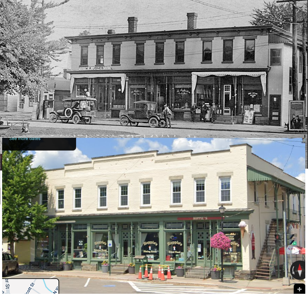 Looking at the modern pic of the brick building, it looks like there is some irregularity in the brickwork at about the same level as where the cornice used to be. Most likely the same building. As is usually the case with "remodels", it looked better as it used to be.