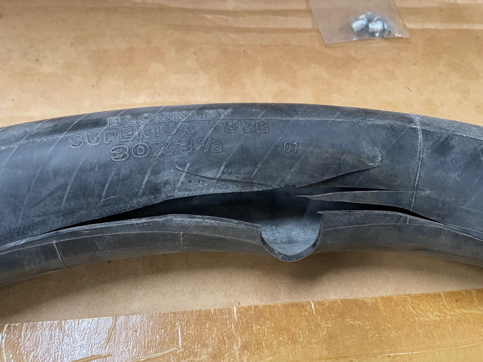 I once bought two excellent rims with two as new, but extremely hard Good Year tyres that even had the blue and yellow flag motif on the sidewall. I fought those tyres off the rims, and salvaged two thick red rubber tubes that were also new. That was about 15 years ago and those tubes are still in use. I learned not to resort to a sawzall when a fellow I was helping on a restoration cut four tyres off, taking with them 4 excellent Olympic butyl rubber tubes. I hope your tube was already shot.