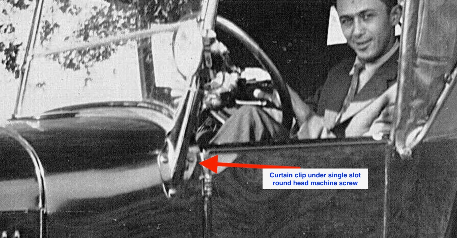 Some factory and period photos of the clip under the single slot round head machine screw, the curtain hook has a round hole, so that bolt didn't have a square under the head. Clip holds side curtains or the wind wing curtain.