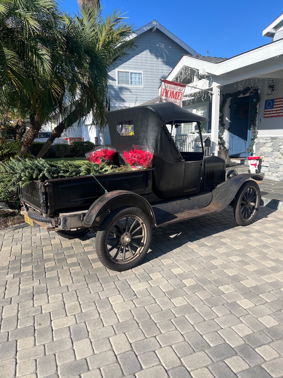 How I wish I had taken a picture when we bought our Christmas tree in 2004 while still living in Phoenix! Our Corvette was not the ideal vehicle for transporting a tree from the lot to our house. So, the only alternative for us was to put the top down on our 1928 Model A Phaeton (pictured sans tree) and have the tree ride in the back seat as a "passenger", its tip extending way past the spare tire in back. Sticking so far out, it probably should have had a red warning flag! Even without being adorned with Christmas ornaments, we received a lot of thumbs up and smiles from cars piled high with Christmas presents. 'Must have made the nostalgic and mythical "Old fashioned Christmas" come to life for them.