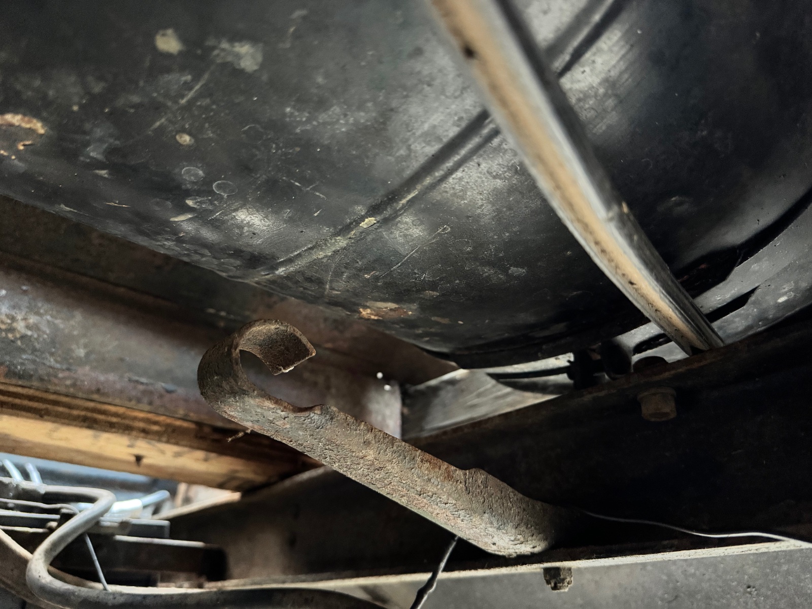 Crawlin around underneath trying to knock 100 years of grease and grime I came across the attached bracket riveted to the drivers side frame underneath the gas tank, pretty sturdy, with a C cup hook on the end of about an inch in diameter. Too small for drivetrain or exhaust, too big for e-brake or lines.