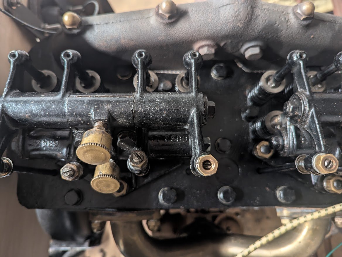 Your head is a model B, but rockers are for the racing model C. Roof modified the B rockers for the C. Upper tower was cut down on one side, and the shaft offset to one side to align with the C valves. Here is what the unmodified B rocker set looks like.