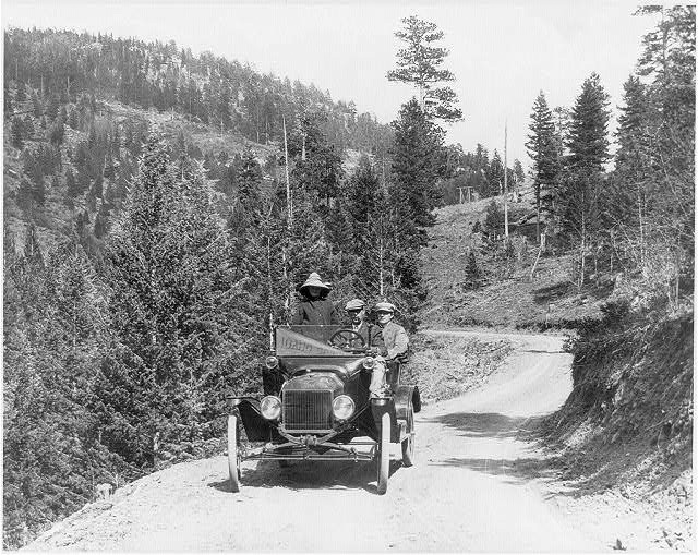 Now, for a bit of ironic comparison? Look at photo number 12. Another 1915/'16 on a dusty rocky mountain road. The "even folding" windshield is folded back and partway down, making it at a glance appear to be the later offset folding type. They are not typical Ford headlamps from 1912 through 1914, the bezels and lenses are too large. One can see the typical smaller gas lamp reflectors in the back of the buckets, and the chimney/bonnets reaching slightly above the headlamp rims.