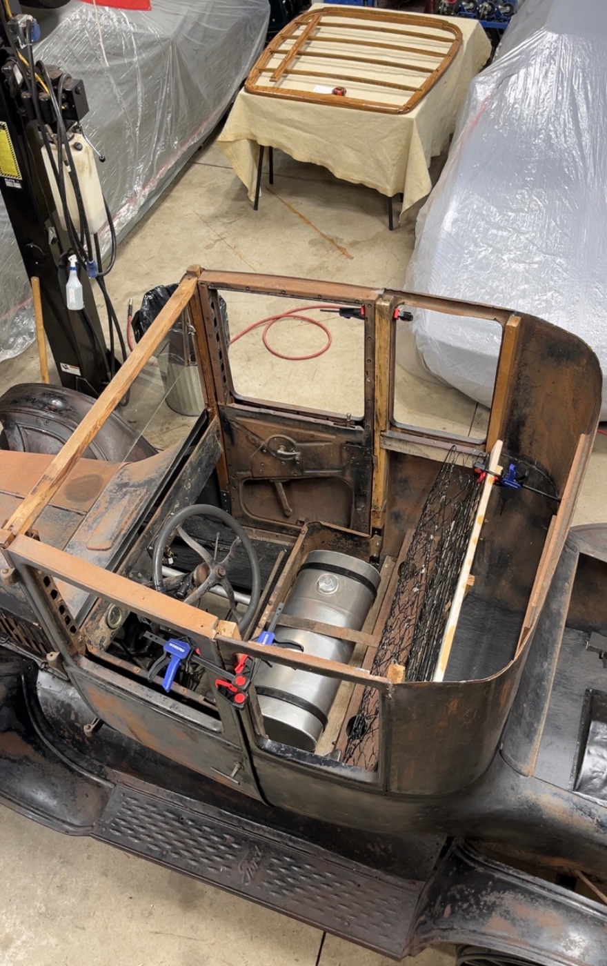 Looks like your Coupe is a very late 24 Coupe because of the steel framed doors. Ford used that style beginning late 24 and onward into 25 when getting ready for the so-called improved 26-27 Ford T’s. There is a sequence that’s used to replace the tops on the 24-25 T Coupes. There are several threads on the subject on the forum. I bought the interior kit for my wood framed earlier 24 Coupe so I would have the beading that goes around the doors. When you buy an interior kit be sure to note that your car has the steel framed doors.