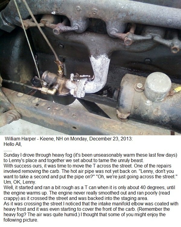 All of that said, a hot air pipe can be useful today in the rare conditions that cause internal icing in the carb or manifold. And leaving one on continuously might not matter, if your typical driving doesn't exploit the full 20hp that your T engine should be able to produce. But for most of us, having one to install if the conditions warrant, could be justified. It's the T version of aviation carb heat, which every pilot knows should be used sparingly. For me, I'll take any small power improvement for my Ts, especially one that is as cheap and easy as not running a hot air pipe. If I ever experience carb icing in my T personally, I will revisit the issue then.