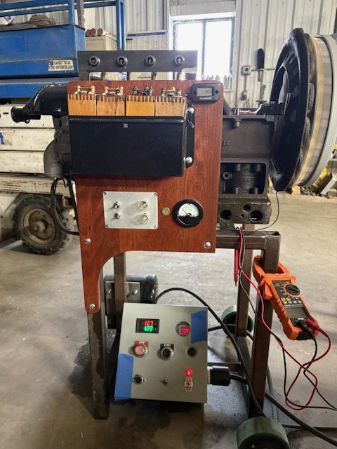 I have made several additions to the test rig that I have been playing around with this winter and have more in mind. I have added an AC volt/ammeter to the inverter supply to make it possible to monitor the power consumption with changes in flywheels weights and magnet types. One toggle switch allows me to change from operating the coil box to operating one or two light bulbs or turning them both off and comparing voltage with load or no load with a more accurate digital voltmeter. The variable speed VFD along with the digital tachometer makes checking with various speeds possible to within 10 rpm. I have added the spark plugs gaped to .073 to simulate the operation under compression mostly to find out how slowly the motor needs to operate to provide adequate magneto voltage for starting. This week I intend to add an indicator/pointer to the magneto frame and make two index plates attached to the flywheel at 180 degree opposition which will make it possible to use an induction timing light to verify timing accuracy of coils and timers at various speeds. I am curious to see how ECCT timed coils compare with Strobospark or HCCT ones in that regard. I think I will be able to check the accuracy of Anderson type timers and make adjustments much more easily than with installation on a car. I have found out that too much magneto voltage turns the coils into fireworks displays at just around 1000 rpm and I am certain that operation like that would destroy the points in short order so I am looking for the "sweet spot" to make low speed starting as good as possible while preserving the points at higher speeds.