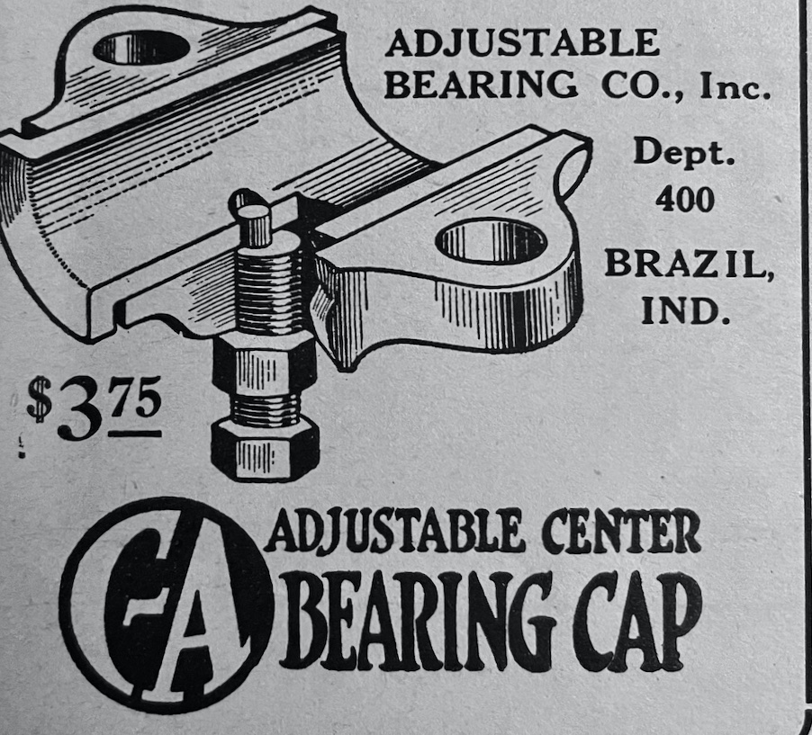 I haven’t seen anything else quite like this. A useful accessory if it works. $65 in today’s money. However, The more I think about it, the more doubts I have. The actual bearing part must be shorter than normal, and that would have to be sized, bored, shimmed or scraped to suit the crank. And then the moving thrust component would have to be made to slide, but not be so loose as to tilt when pushed only at one point by the wedge.