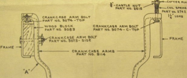When I got my car, it had no wood blocks/bolts at the rear engine mounts. I bought repros and installed them as Ford directed. The car now tracks slightly better and seems to have a slight reduction in vibration. Note that the side bolts are NOT intended to be pulled up tight. My car does not have the spring arrangement on the passenger side mount as shown above. I think that the spring mount or the passenger side ear may have been a late issue modification intended for TT trucks in severe service on very rough roads. It looks to me like it would result in notches being cut in the upper frame flange at the mounting point due to the mounting ear chafing against the frame. If I used that assembly, I'd want to put a leather insulator between the pan ear and the frame.