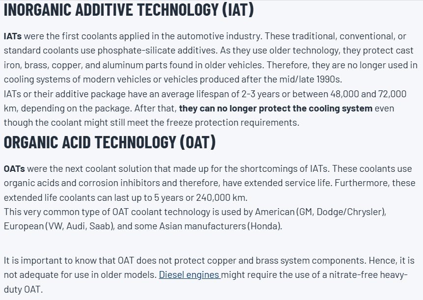 Folks can play games with other coolants like OAT and Universal Coolants (Hybrid OAT) but at $1600 a pop, my radiator is going to get (green) coolant that was designed to protect it. I also know that corrosion protection ceases after 2-3 years, so it gets replaced periodically.