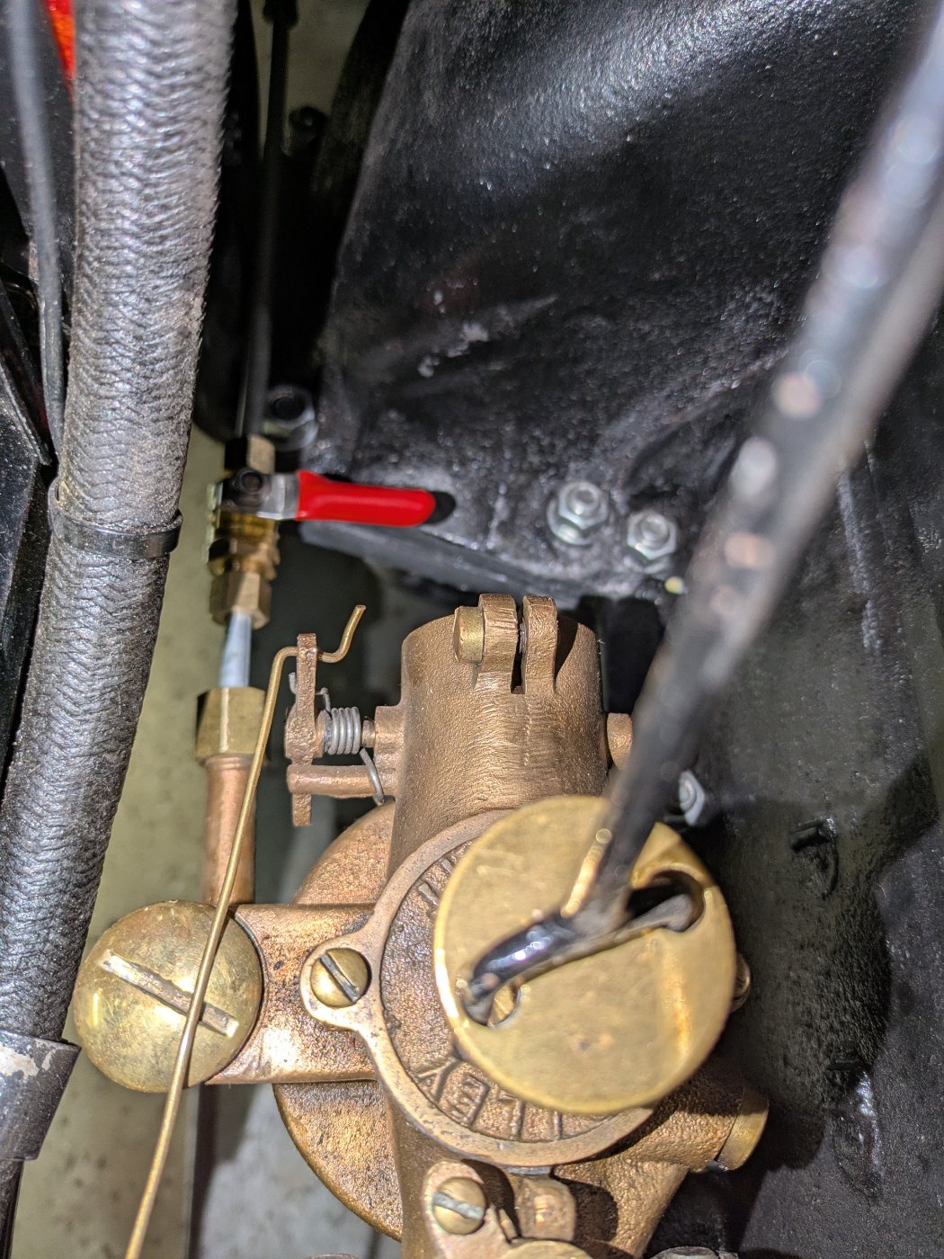 The 1911 T that I restored came with a Holley H1 carburetor, which Corey Walker refurbished for me. It's a great running carburetor, but it has an elbow that doesn't allow the installation of the usual shutoff elbow that is often installed on later carburetors as a safety feature.