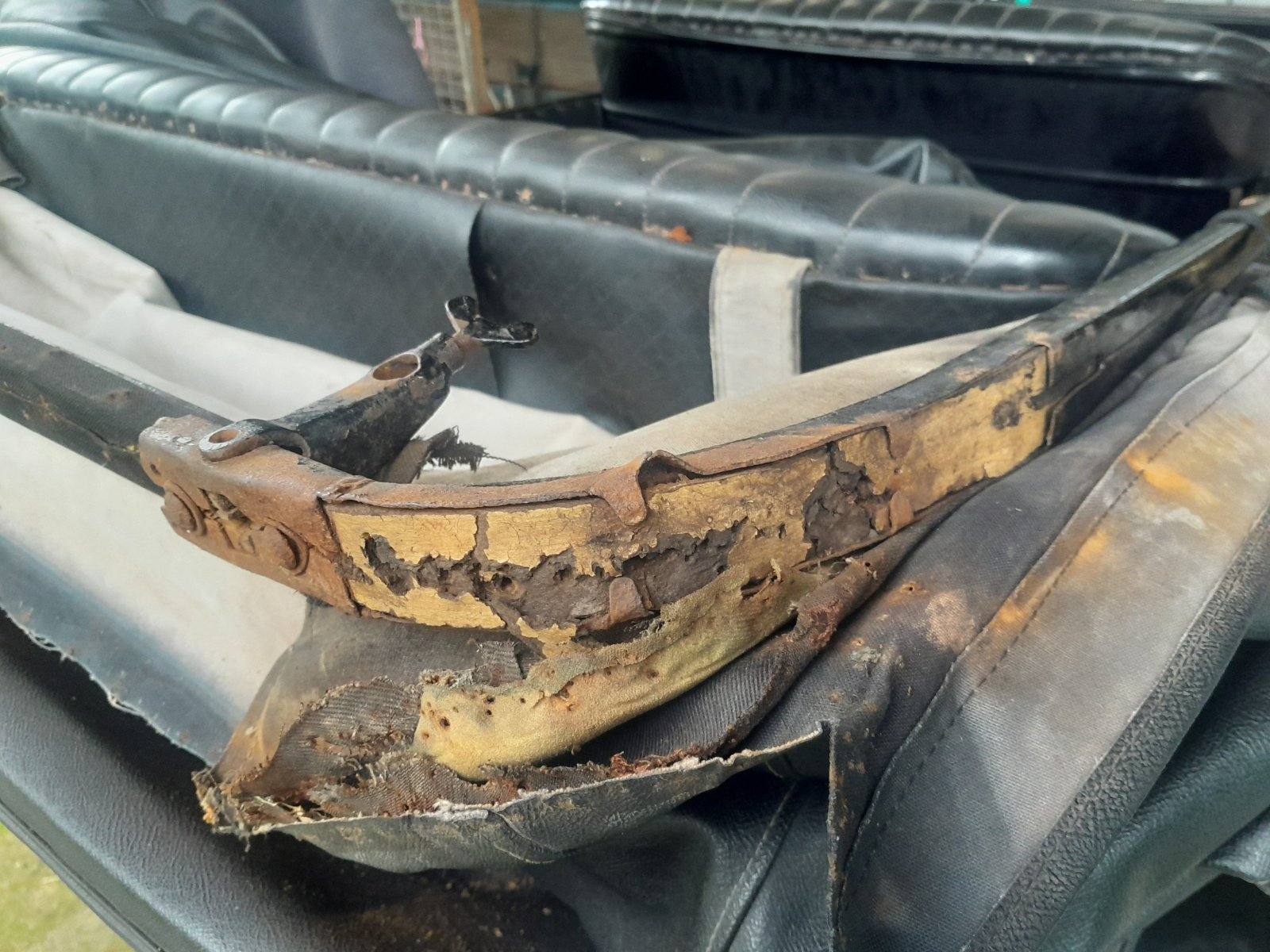 The rot in the front bow of my 24 Tourer finally broke through the front wood by the windshield clamp so needed attention... and on removal of the top, it seems the bends were no better...