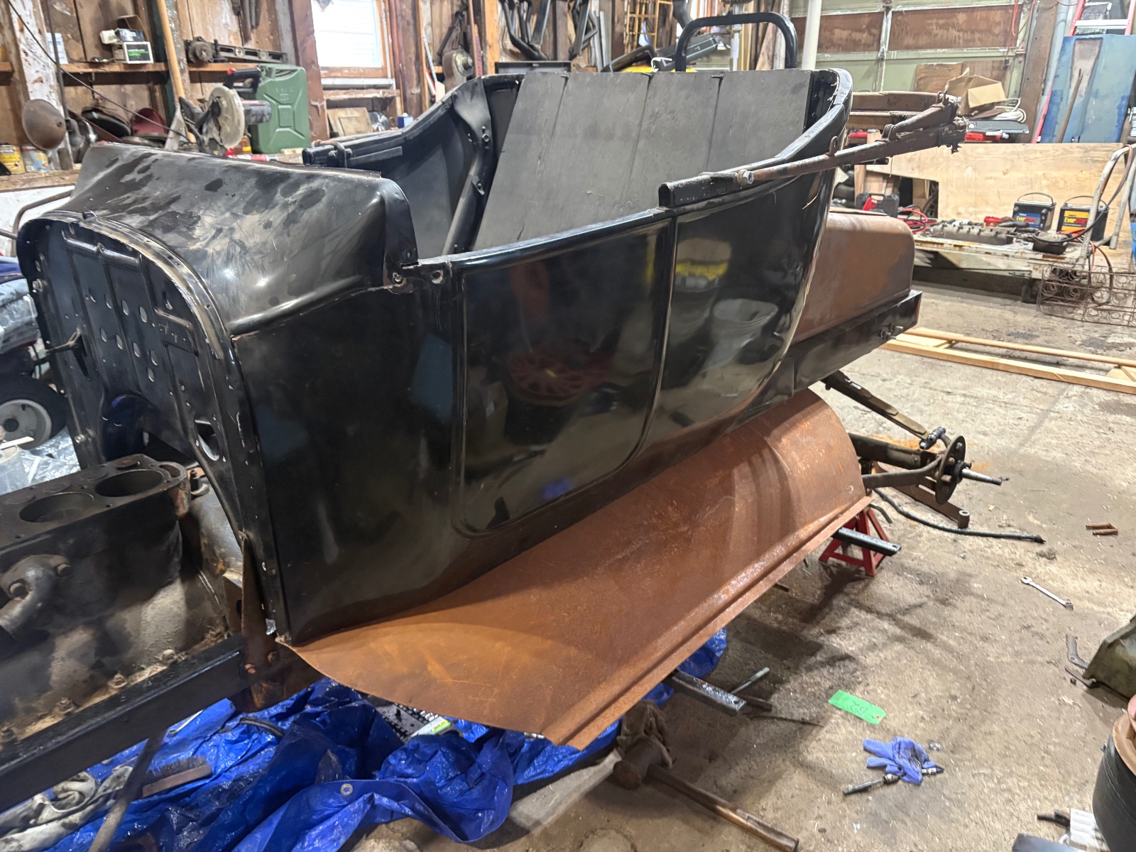On my project, bought it wooded, with metal already on and painted Ford engine blue, did have to fit new primed panels on the lower side, and rear of the subframe, spent some time fitting each to the wood and squared all up. Note in one photo the old original panel (had rust holes) but used to to locate the 3 holes for the rear fender bracket forging.