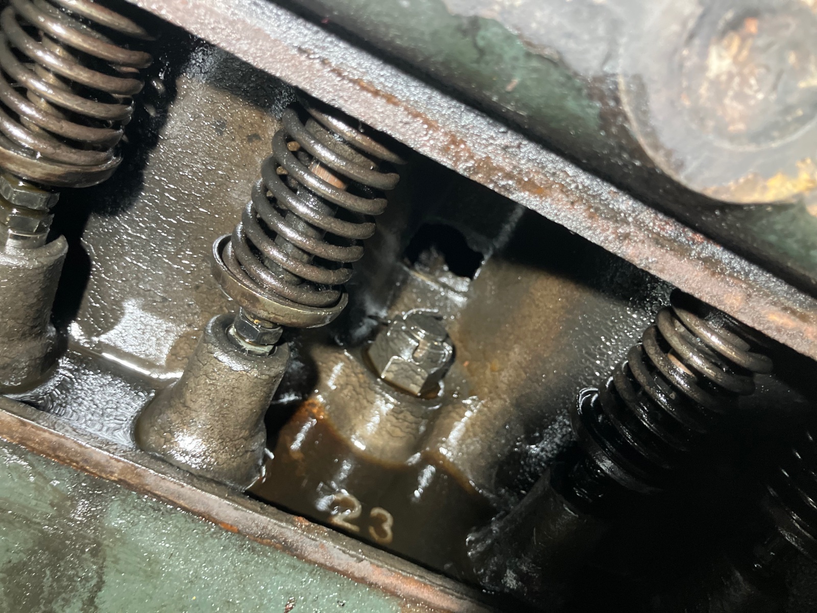 Since I pulled the generator and vaporizer out, I thought I would use that opportunity and pull the valve cover off too and just take a look. Between the valves I found the number 23. Is that the production year? It’s a 1927 T, but it has the hole for the throttle linkage. The engine number says it’s a January 1927 engine.