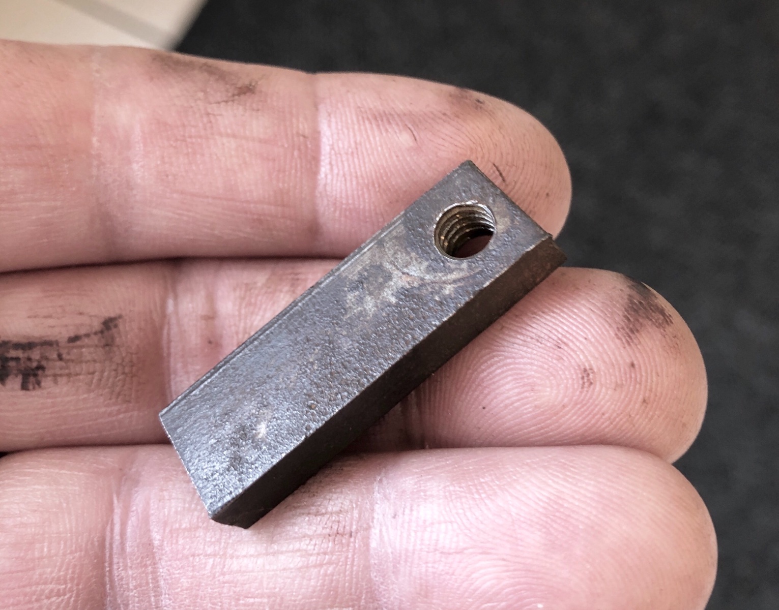 I was driving around in the T last night and felt something small fall on my left foot. It was dark and I didn’t know what it was. This morning I found the peculiar long nut that holds one of the windshield brackets to the body. Turns out a squeak I’ve been chasing was due to this loose screw. So, I found the long nut (shown) but I couldn’t find the 1/4” counter sunk slotted dome head machine screw. (Shown) Anyone have a decent spare?