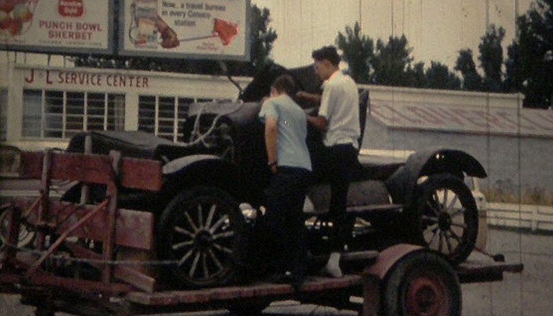 This is Rich Bingham and I in 1964 with my first T on the trailer. I traded Rich the Runabout body for a Touring body. The same chassis is now under my Tudor. The photos were snatched from 16mm film my Father took. That would be 55 years ago. It is a 1925 T.