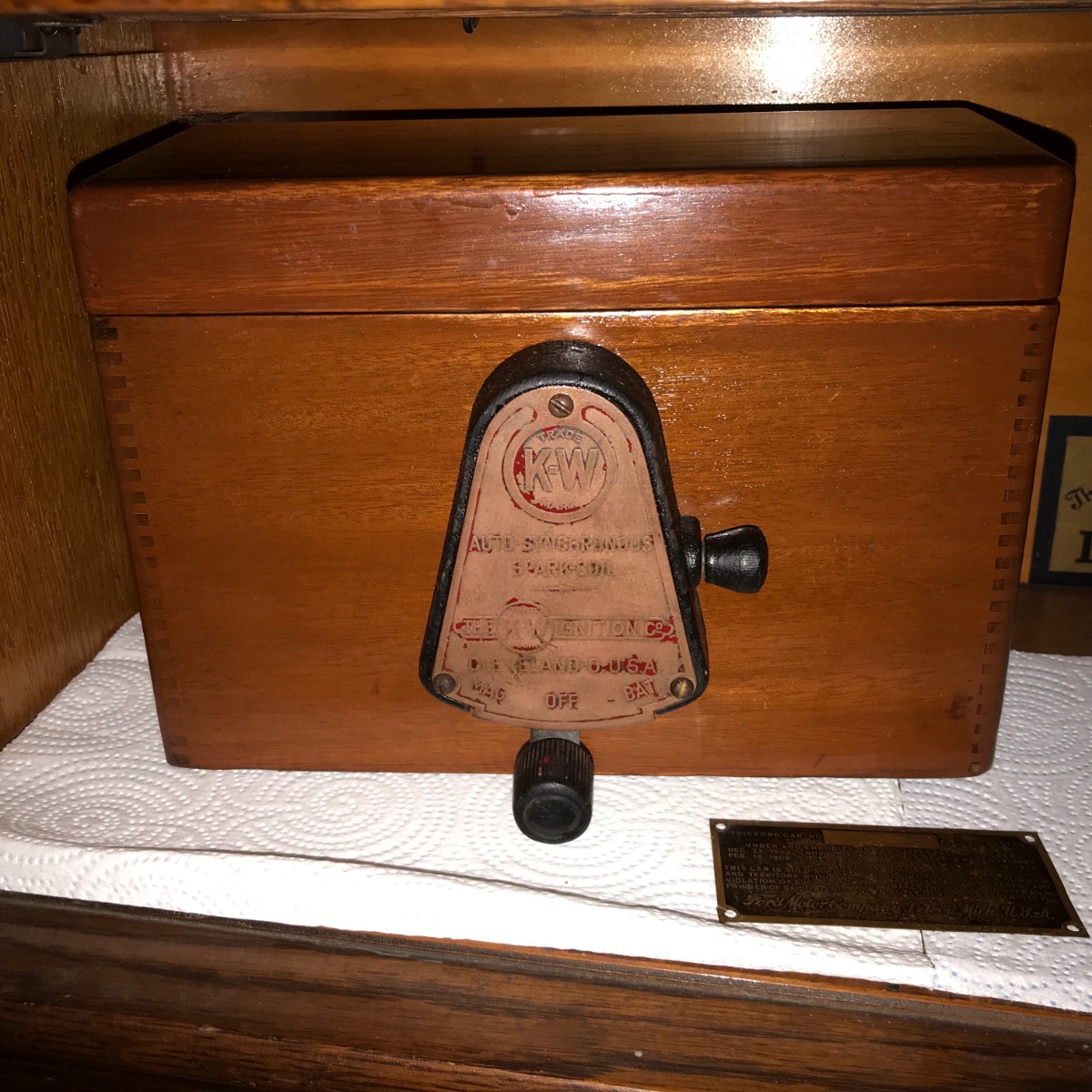 A side view of that box would nail it! The red paint on the switch place was done at a later date. The only paint on the switch plate when new was in the KW circle. Your coil box has been revarnished at some point. They were originally the same color as the firewall.