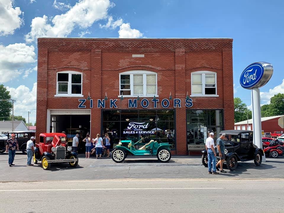 ZINK MOTOR CO began business in 1916 selling Ford Modet Ts and remains a Ford dealer today. ZINK's building itself was designed by Ford Motor Co and remains as it was back in the day. This past June 13th[image][/image] the owners held a special early Ford "meet" which drew cars from early T's to a pristine 1932 Cabriolet. Among the vehicles was an original 1919 TT which was purchased new at ZINK and still runs with the original cast iron pistons. I have included a picture below.