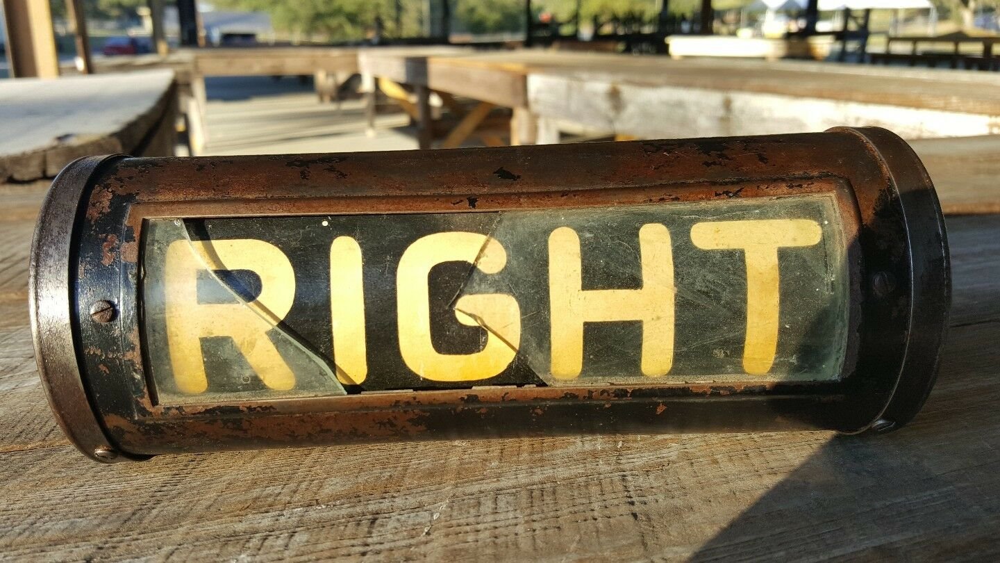 The Left/Right/Stop/Back are on a drum that rotates inside the light housing and are controlled by a switch mounted on the steering column. They have a spade mount and there is a small light bulb inside the drum. What is the significance of the white and blue lens on the ends?