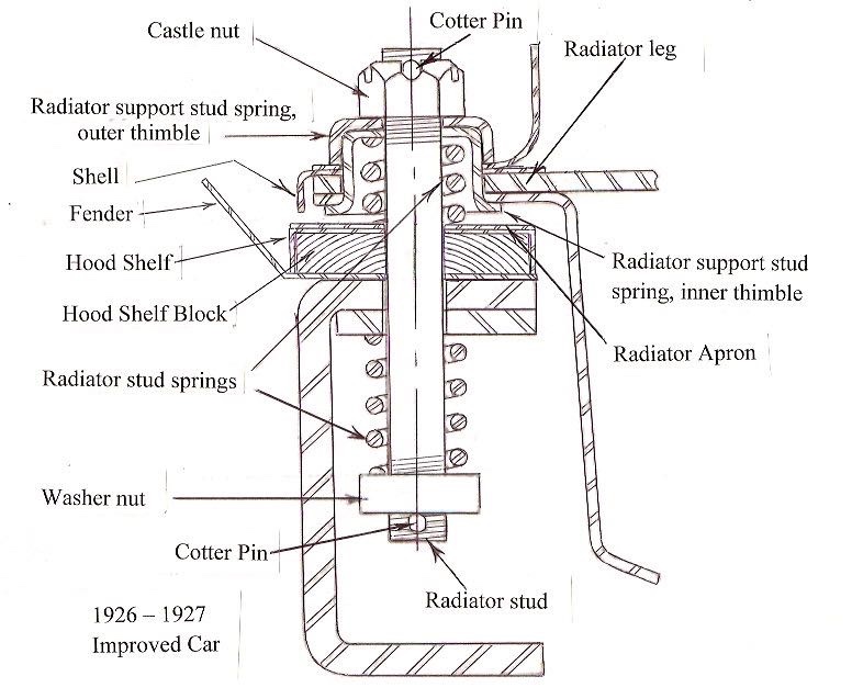 I went to put on the original apron that I removed over 50 years ago on a 26 coupe. When the crank hole and screw below hole is aligned up, the 2 tabs that go over the radiator studs are about a 1/2" above the frame. I don't remember anything between the tabs and the frame, am I wrong. I'd appreciate a diagram of how this fits together.