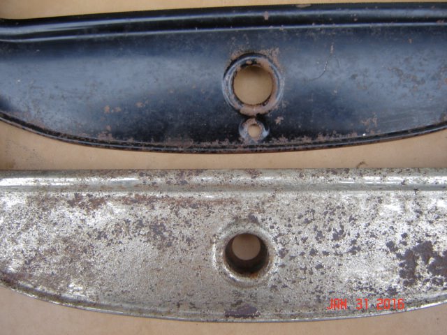 The second one has the 3 slots to crimp the trim piece in place. It does not have the side tabs like the first, and does not have the hole for the screw under the crank hole. The measurement on this one is 5 3/8". This one has the collar at the crank hole, but no hole for the screw beneath. Measured through the crank hole, it is 5 3/8" deep. Is this one for a 26 model improved car, before the screw was added to the front mounting?