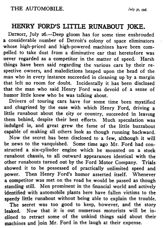 In early 1907, Ford was reported to be developing a light six to be produced in a touring car. One of these motors, in roadster form, exists in Australia. At the bottom of the article below is a brief mention of the six cylinder Ford. News stories about Henry Ford driving this six, in roadster form around Detroit, circulated in the summer of 1908: