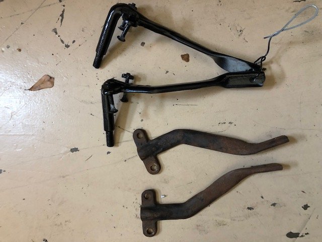 Mounting the front irons to the seat box like this, casts the angle of the irons 15º forward. I don't know why, but there must be a reason, maybe it helps support the front bow or something whilst traveling. Because it only lays over the windshield and is held in place by the front windshield straps, the top straps that run across the bows from the rear bow and the covering.