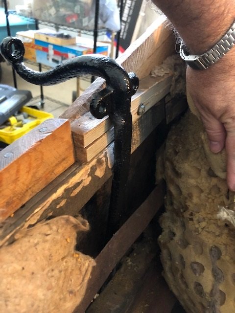This is where they attach, these aren't attached correctly either, had to tell this guy at the Bakersfield Swap Meet about the mistake in their location, so he could correct it. He said he wasn't going to bother because the armrest is already notched for the top part of the iron. I told him I made the same mistake and patched the notch, once the padding is on and the covers, nobody is going to know you patched it, but you may notice some problems keeping this way instead of changing it, because they did it for some reason. He agreed and changed it.