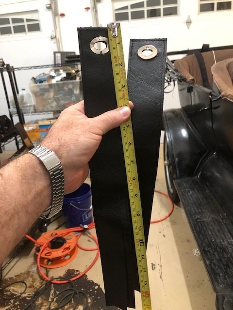 So, you got a roll up real curtain too, eh? Can't for the life of me figure out why, I know most people say putting a top on your car slows it down some, that's true with 1 man tops, but not with 2 man tops. 1 man tops have gypsy wings that wrap around the real bow to the second bow and snap on, this cups wind in the rear curtain. A 2 man top doesn't have that, so no wind isn't caught by the curtain. Anyhoo, those straps you're holding are to hold the rolled up rear curtain, they nail to the top of the rear bow with a standoff nail, that the eyeholes hook onto.