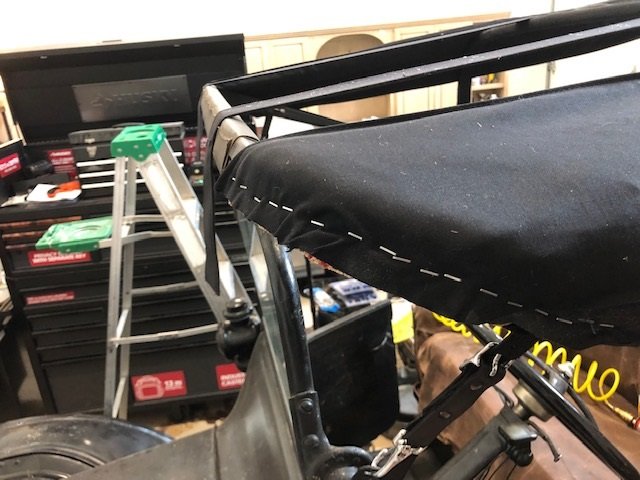 I sure hope where you're at your having some really nice and hot weather or your garage temp is set to 100 or so...I set my top outside last summer in 104º weather. It was the only way to get that fabric to stretch as much as we stretched it to. We did and redid it 3 times all around the car, to where Derrick thought that the seams would rip out, but I knew better, they're double over locked seams, so don't worry about pulling that fabric to tight...you cant over do it.