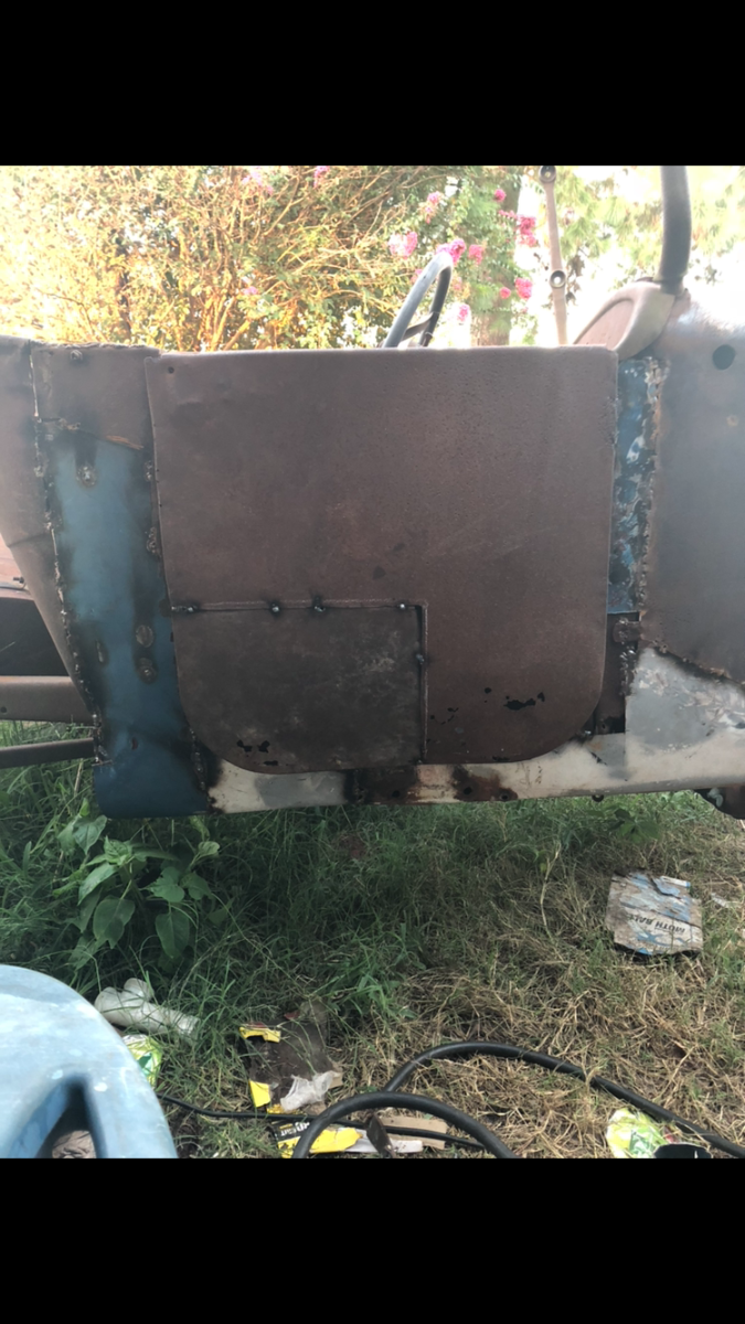Somebody on another forum had mentioned using old Chevrolet truck doors for patch panels. They work well for the bottom of the body because they have a brake line in them already but not quite 90*, and the metal is slightly curved already. I know this isn’t a T body but it’s similar. The back doors were attached so I used those skins to make one door skin, the other side was better.