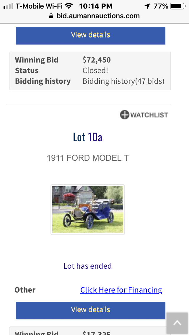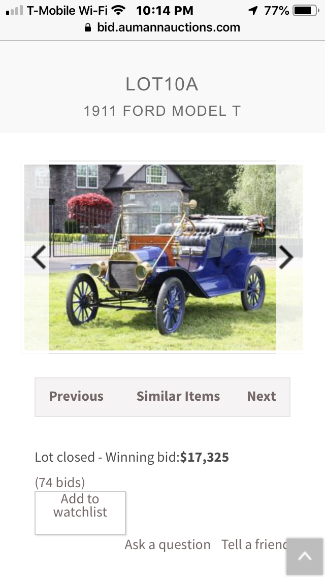 I think someone got a good deal on the 1911 touring. The auction's description didn't do the car any justice and they only showed a photo of the left side of the engine. Had they shown the right side, bidders would have seen it was an open valve engine and a six rivet rearend. With exception of the shade of blue, it was a pretty nice car and looked mostly correct.