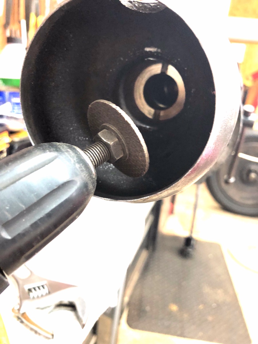 Tool made from a hard woven cutoff blade, made to the diameter by running the disc on the elec. drill, with the edge of the cutoff blade on the running wheel of the bench grinder, shaving the dia. of the blade down to the o.d. of the bushing face.